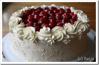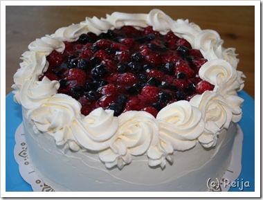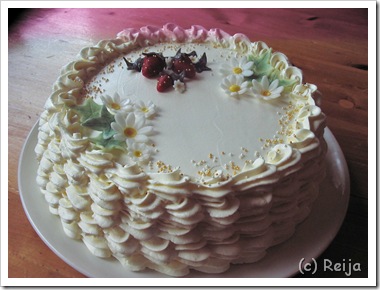 Naapureillemme syntyi kesän alussa ihana pikkumies! Olin ajatellut jotenkin perhettä muistaa, ja mikäs sen mukavampaa kuin kakun tekeminen 😉 Kakusta tulikin yllättäen pikainen versio siitä, mitä olin ajatellut. Koko kakun tekemiseen koristeineen kaikkineen meni ehkä kolmisen tuntia… Maalauskin on siis pikaisesti sudittu. Koristeet kaikki sokerimassaa. Maalaus sokerimassalle tomuvärein. Kakussa peruspohja, kostutettu sitruunalimsalla. Täytteenä kermavaahtoa, mansikoita…